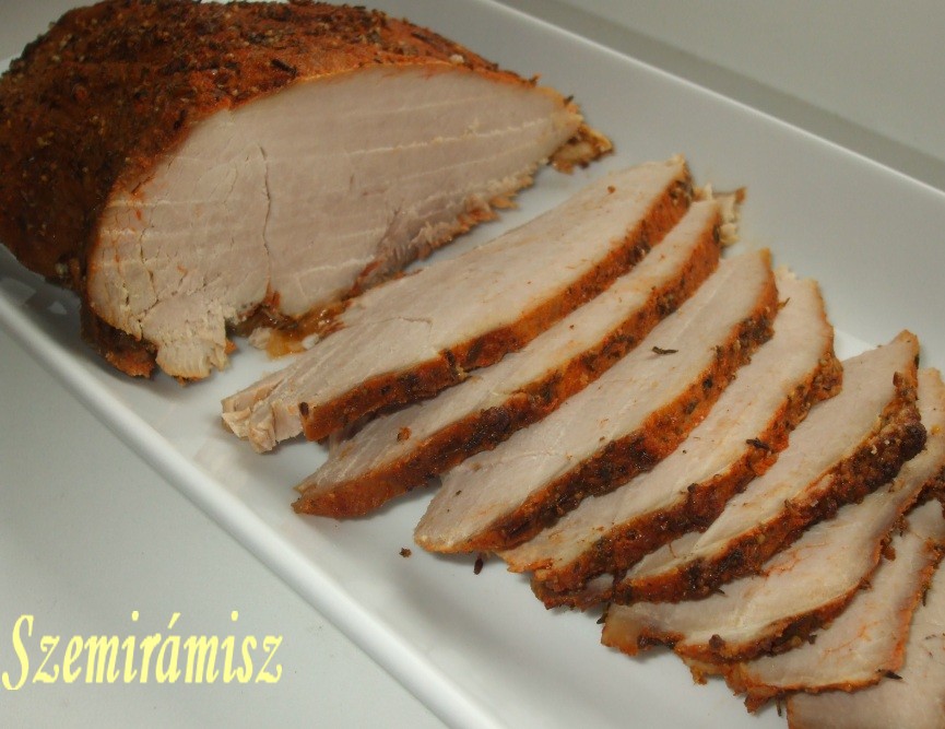 A húst nagyon szépen lehetett szeletelni, melegen és hidegen is. Hidegen tálalva majonézes kukoricasalátát adtam mellé.